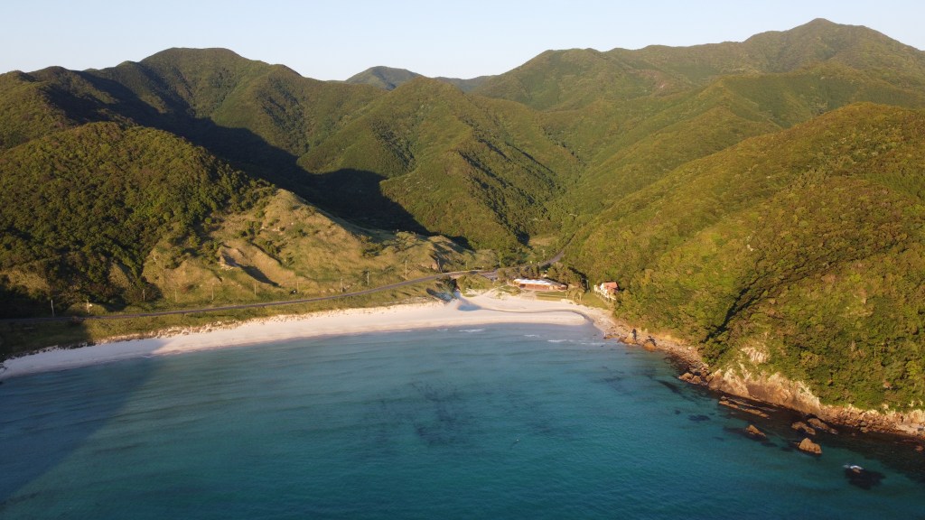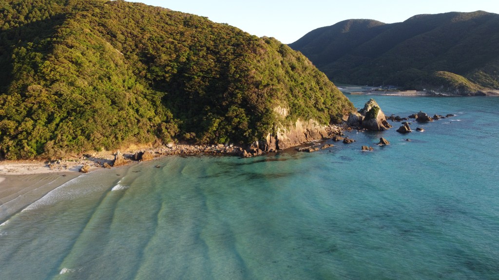 The northern part exudes a wild and tropical charm. As you traverse road 162, passing by landmarks like Dozaki Church and Togis Port’s red bridge, you’ll come across quaint seaside entries that transform into enchanting views during sunset. Continuing along the road for about 2 kilometers, take a right turn onto a smaller road leading to Hantomariura Bay.